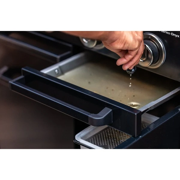 Der 4 Series Onyx Gasgrill bietet hochwertige und zuverlässige Materialien in Verbindung mit viel Komfort, und einen zusätzlichen Seitenkocher für die Zubereitung von Gemüse oder Soßen. Die praktische InstaStart-Zündung ist eine in den Gasregler integrierte elektronischen Zündung. Beim Drücken des Reglers wird durch Spannung der Funke gezündet, und beim Drehen des gleichen Knopfes strömt das Gas aus, was direkt durch den Funken gezündet wird. Die patentierte Blue Flame Power Technologie heizt den Grillrost schnell und sehr gleichmäßig verteilt auf die benötigten Temperaturen auf, und die Even Temp Technologie sorgt für eine konstante Hitze auf der gesamten Grillfläche. Dank dieser patentierten Technologie wird eine Temperatur von über 250°C auf einem Großteil der Grillfläche erreicht. Die zahlreichen optional erhältlichen Campingaz Culinary Modular Zubehöre sorgen für noch mehr kulinarische Vielfalt beim Kochen und Grillen. Mit den vier gummierten Gelände-Schwerlastrollen und zwei Feststellbremsen lässt sich der 4 Series Onyx zuverlässig auf kleinstem Raum manövrieren und sicher abstellen. Der „Push2Fold“ abklappbare linke Seitentisch bietet Platz für Grillgut und Zubehör. In den neuen Gasgrill-Modellen 2021 ist die innovative Campingaz InstaClean Aqua Technologie verbaut. Dank des Wassers wird das anschließende Reinigen des Grills erleichtert. In die von vorne zugängliche Fettauffangschale wird Wasser gefüllt, was das Einbrennen von Fett und Essensresten in der Schale verhindert. Das beim Grillen verdunstete Wasser wirkt außerdem im gesamten Grillinnenraum fettabweisend, sodass sich das Fett nicht so leicht an dem Material festsetzen kann. Dank dieses cleveren Systems muss man bei der Reinigung nicht angestrengt schrubben, stattdessen können die Teile einfach abgewischt werden. Das benutzte Wasser kann ganz einfach durch einen Abfluss in der Fettauffangschale abgelassen werden. Die Onyx Modelle sind außerdem mit einem Schmutzwasserbehälter inkl. Filter ausgestattet, sodass das Wasser von festen Bestandteilen getrennt werden kann, für eine noch einfachere Entsorgung.Art.-Nr.: 1671794