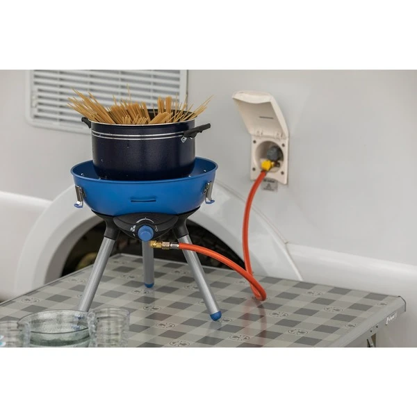 Der Party Grill 400 Caravan Connect von Campingaz ist ein leistungsfähiger und vielseitiger 30mbar Campingkocher mit Anschluss für die externe Gassteckdose des Wohnwagens. Er bietet den Campern die Wahl zwischen fünf verschiedenen Koch- oder Grillflächen, und ist damit bestens für den Einsatz auf dem Campingplatz geeignet. Zum Kochen vieler verschiedener Gerichte bietet der Party Grill 400 Caravan Connect Gaskocher die Wahl zwischen normaler Kochflamme, Grillen auf dem Gitterrost, wendbarer Grillplatte und dem Deckel, der sich als Wok umfunktionieren lässt. Die Zündung des Campingkochers ist dank der Piezozündung bei jedem Wetter schnell und einfach, während der integrierte Wasserbehälter das heruntertropfende Fett sammelt, für eine leichte Reinigung nach dem Gebrauch. Der Party Grill 400 Caravan Connect ist dank seines verschließbaren Deckels ultra-portabel. Alle Bestandteile des Party Grill können im Inneren untergebracht werden und sind dort bis zum nächsten Einsatz sicher aufgehoben. Sogar die Beine lassen sich im Inneren verstauen und sind im Handumdrehen wieder an- oder abgebaut.Art.-Nr.: 1863436