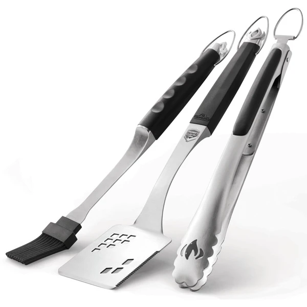 Das 3-teilige President’s Limited Edition Grillbesteck 70036 von Napoleon enthält Pfannenwender, Grillpinsel und Zange in hochwertigem Design, aus Edelstahl mit schwarzen Griffen. Der Grillpinsel ist mit Silikon-Borsten ausgestattet. Der Wender eignet sich ideal für Steaks und anderes größeres Grillgut. Er hat einen Wellenschliff und eine scharfe Kante. Die Grillzange mit dem praktischen Schließmechanismus ist ideal zum Hantieren mit feinem, zartem Grillgut. Alle drei Teile des President’s Limited Edition Grillbestecks haben einen großen Haken zum Aufhängen.Art.-Nr.: 1496494
