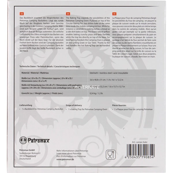 Das Backblech für den Petromax Camping-Backofen ist eine unverzichtbare Ergänzung, um knusprige Frühstücksbrötchen und Pizzen zuzubereiten. Durch die kluge Führung von Unter- und Oberhitze entstehen perfekte Backergebnisse unterwegs mit dem Camper oder Van und überall dort, wo kein Backofen vorhanden ist. Die seitliche Luftführung, entwickelt in der Petromax Drachenwerkstatt, sorgt für eine Luftzirkulation wie im heimischen Backofen. Einfach das Backblech auf der Basisform platzieren und die optimale Hitze erhalten. Mit dem runden Pizzablech aus Edelstahl kann man in Kombination mit dem Camping Backofen auch zwei Gerichte gleichzeitig zubereiten: Auf dem Blech überbacken knusprige Nachos, während unten bereits das feurige Chili köchelt. Mit den beiden seitlichen Henkeln wird die Pizza direkt mit dem runden Blech serviert.Art.-Nr.: 1883438