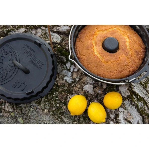 Mit der gusseisernen Gugelhupfform gf1 von Petromax backt man nicht nur leckeren Kuchen, auch frisches Brot und Aufläufe gelingen in der klassischen Kranzform ideal. Der Gussdeckel der Form vereint mehrere Anwendungsmöglichkeiten: Er ermöglicht das Backen mit Oberhitze in der Draußen-Küche und verfügt umgedreht über eine Tortenbodenfunktion. Die gusseiserne Gugelhupfform mit dem praktischen Tragehenkel aus Edelstahl zum Aufhängen ist hervorragend für das Backen und Kochen über offenem Feuer geeignet, kann aber auch problemlos für das Backen im Backofen verwendet werden. Das Gusseisen der Gugelhupfform stellt sicher, dass die Wärme effizient gespeichert und gleichmäßig an das Backgut weitergeleitet wird. Außerdem ist die Oberfläche bereits vorbehandelt (seasoned finished) und macht somit ein erstmaliges Einbrennen unnötig. Auf dem Deckel der Gugelhupfform lassen sich dank erhöhtem Rand Glut oder Holzkohle einfach platzieren. Auf diese Weise werden Kuchen, Brot oder Auflauf gleichmäßig gar. Doch die Form bietet noch mehr. Der Deckel mit Tortenbodenform kann umgedreht zum Backen von Tortenböden sowie für leckere Quiches und Tartes genutzt werden. Auf seine drei Füße gestellt, dient er zudem als Pfanne oder als praktische Servierplatte.Art.-Nr.: 1533728