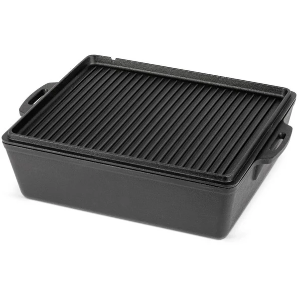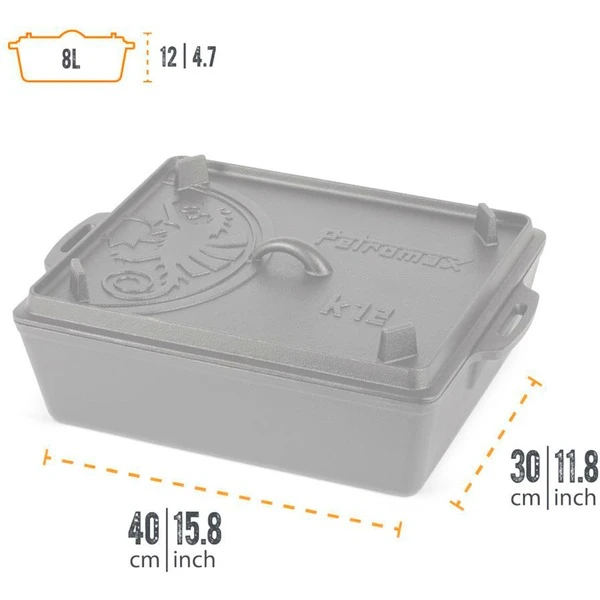 Die extragroße Petromax Kastenform k12 ist perfekt für Brot, Kuchen, Aufläufe und ähnliches geeignet. Er reicht für die Versorgung einer ganzen Mannschaft von Draußen-Abenteurern mit Auflauf, Braten oder Lasagne. Der Deckel der gusseisernen Formen lässt sich beim Draußen-Kochen mit Glut oder Briketts bestücken, so dass eine hervorragende Rundumwärme entsteht, wie bei einem Feuertopf. Außerdem kann der Deckel mit Füßen und Rillenprofil umgedreht perfekt als Steak- und Grillpfanne draußen verwendet werden. Im Backofen funktioniert die Guss-Kastenform als Bräter oder für leckeren Nachtisch.Art.-Nr.: 1914391