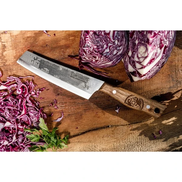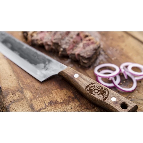 Das Petromax Kochmesser chknife17 ist ein in Handarbeit in Solingen gefertigtes, vielseitiges Messer zum Schneiden von Gemüse, Fisch und Fleisch. Hochwertiger Stahl und ein robuster Griff aus Walnussholz sorgen dafür, dass das rustikale Messer im Petromax-Design mit Schriftzug und Drachenlogo ein verlässliches Werkzeug ist. Dank einer Materialstärke von 3mm kann man Gemüse präzise hacken, Fisch filetieren und Fleisch einfach schneiden, um sie über dem lodernden Feuer zu braten. Für den aromatischen Geschmack kann man außerdem mit dem Kochmesser frische Kräuter wiegen. Durchgehender rostfreier Stahl und der fugenlos vernietete Griff ermöglichen eine sichere Handhabung und Hygiene. Das Petromax Kochmesser ist ein individuelles Messer, das mit starkem Design, präziser Schärfe und perfekter Verarbeitung punktet. Die Oxidschicht und der herausragende Schliff in Handarbeit machen das Kochmesser zu einem ganz persönlichen Werkzeug, jedes Stück ein Unikat. Die Klinge des Petromax Kochmessers hat eine Länge von 17cm und wurde per Hand in Solingen gehärtet und geschliffen. Diese Eigenschaften machen das Kochmesser besonders scharf, langlebig und widerstandsfähig. So wird es zum unverzichtbaren Utensil für jedes Kocherlebnis im Freien.Art.-Nr.: 1908401
