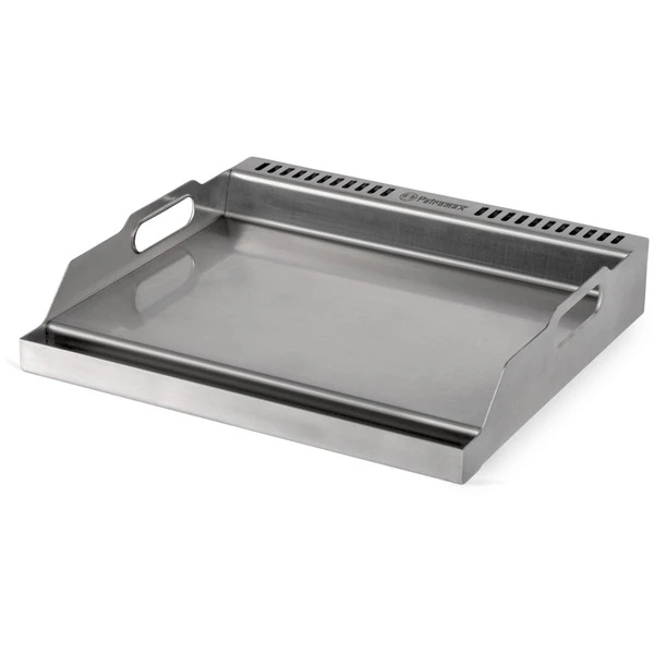 Mit der Plancha Grillplatte von Petromax erweitert man den Petromax Gastisch um eine typisch spanische Plancha-Platte mit durchdachten Details. Die Grillplatte aus Edelstahl ermöglicht dank unterschiedlicher Temperaturzonen beste Ergebnisse. Hier brutzeln deftige Fleischspezialitäten extra saftig, während zeitgleich Grillgemüse oder würzige Shrimps am Rand bei geringerer Hitze darauf warten können, serviert zu werden. Mit Hilfe der praktischen Henkel kann man die Platte einfach auf den Gastisch legen, sie passt auf alle Modelle mit Einzel- und Mehrfachbrenner. Fettarmes Grillen gehört von nun an selbstverständlich dazu, da die Auffangrinne an der vorderen Kante während des Grillens dafür sorgt, dass Fett aus den Speisen abläuft und nicht in Kontakt mit der Flamme kommt. Anders als beim Grillrost bleiben auch gefüllte Champignons, Kartoffelspalten oder Wassermelonenstücke sicher auf der Grillplatte liegen. Schlitze am oberen Teil der Grillplatte sorgen für die notwendige Belüftung und vermeiden einen Hitzestau. Nach dem Grillen kann die abgekühlte Plancha an den Tragehenkeln vom Gastisch genommen und einfach separat gereinigt werden. Als optimale Erweiterung für den Gastisch bietet die Edelstahl-Plancha alle Vorteile des spanischen Grillens für vielfältige Grill-Ergebnisse in der Campingküche.Art.-Nr.: 1881588